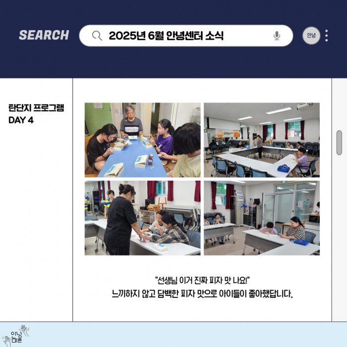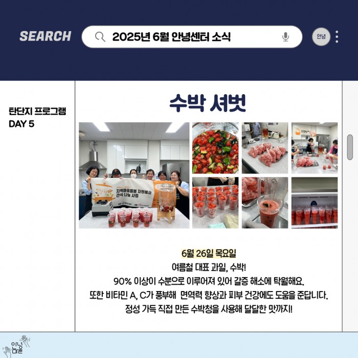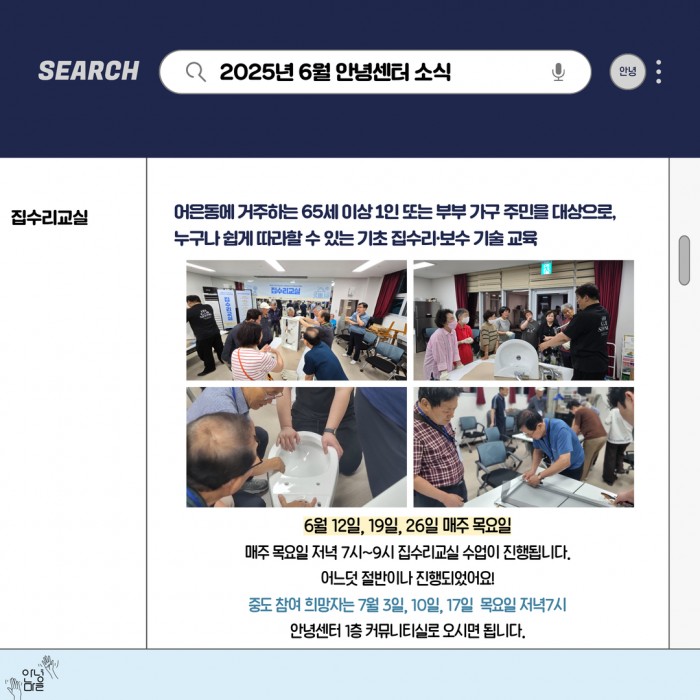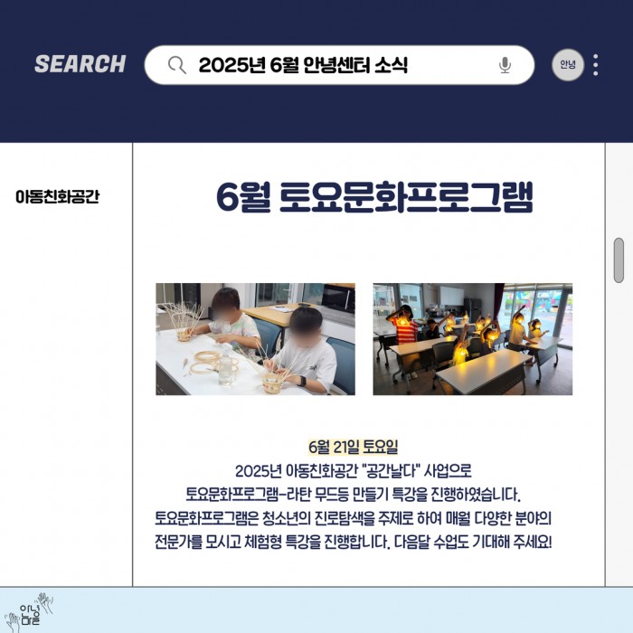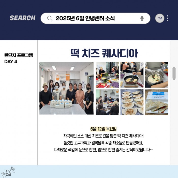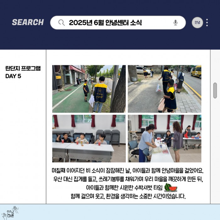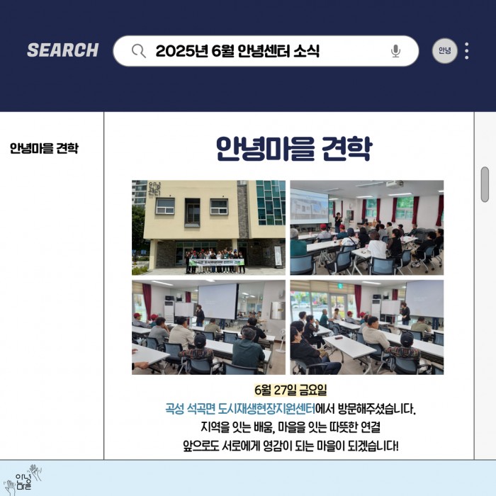 2025년 6월, 안녕센터는 더욱 활기찼습니다! 건강한 간식으로 마음을 채운 탄단지 프로젝트, 실생활에 꼭 필요한 집수리교실, 멀리 곡성에서 찾아와 안녕마을 견학, 그리고 새롭게 문을 연 어궁동 룰루랄라 문화센터까지! 함께 만들고, 나누고, 배운 모든 순간에 마을과 사람 사이 따뜻한 연결이 있었습니다. 6월의 이야기를 카드뉴스로 만나보세요!