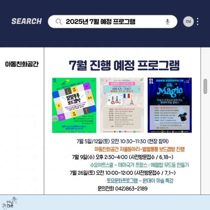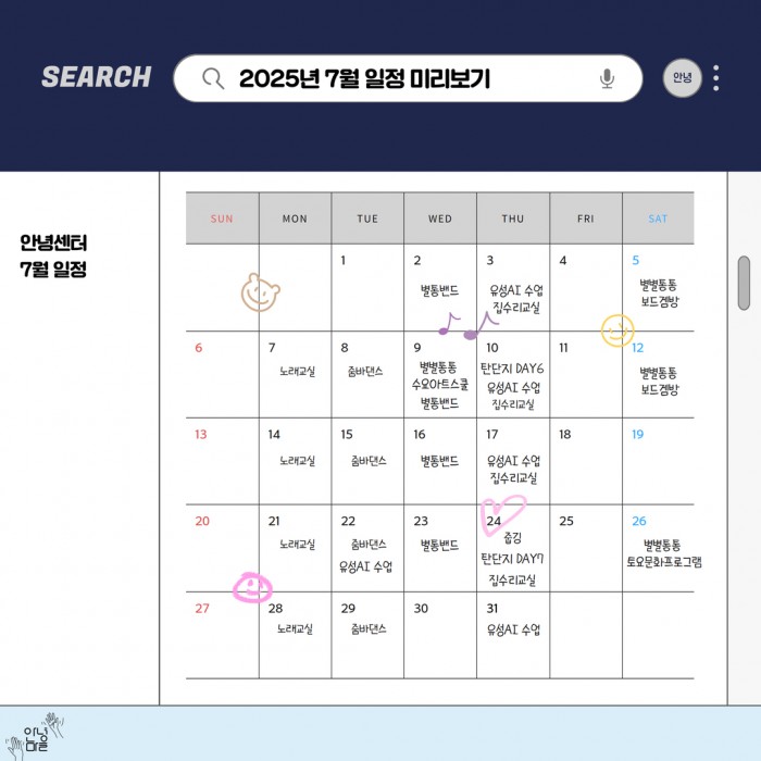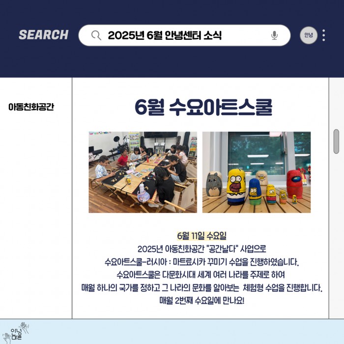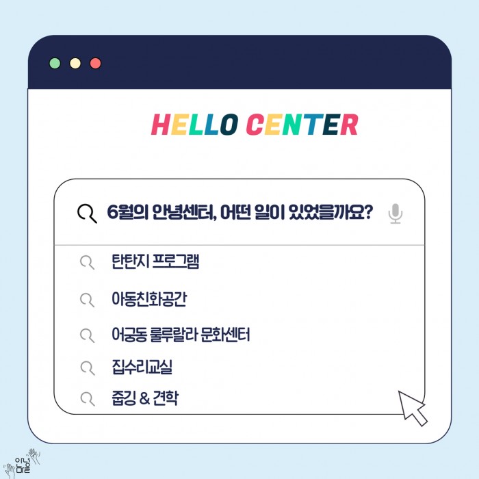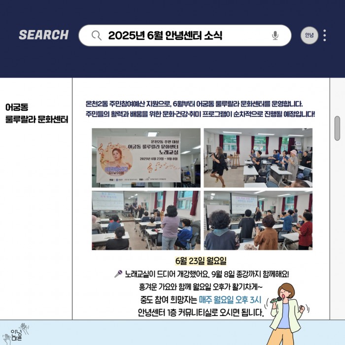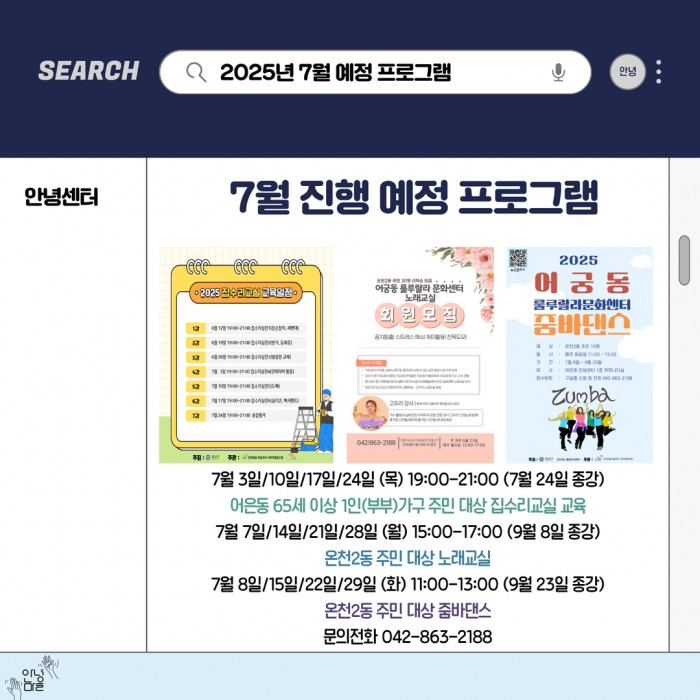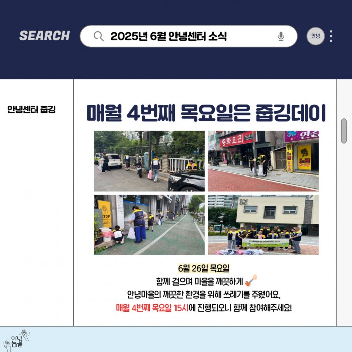 2025년 6월, 안녕센터는 더욱 활기찼습니다! 건강한 간식으로 마음을 채운 탄단지 프로젝트, 실생활에 꼭 필요한 집수리교실, 멀리 곡성에서 찾아와 안녕마을 견학, 그리고 새롭게 문을 연 어궁동 룰루랄라 문화센터까지! 함께 만들고, 나누고, 배운 모든 순간에 마을과 사람 사이 따뜻한 연결이 있었습니다. 6월의 이야기를 카드뉴스로 만나보세요!