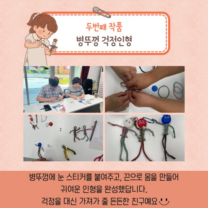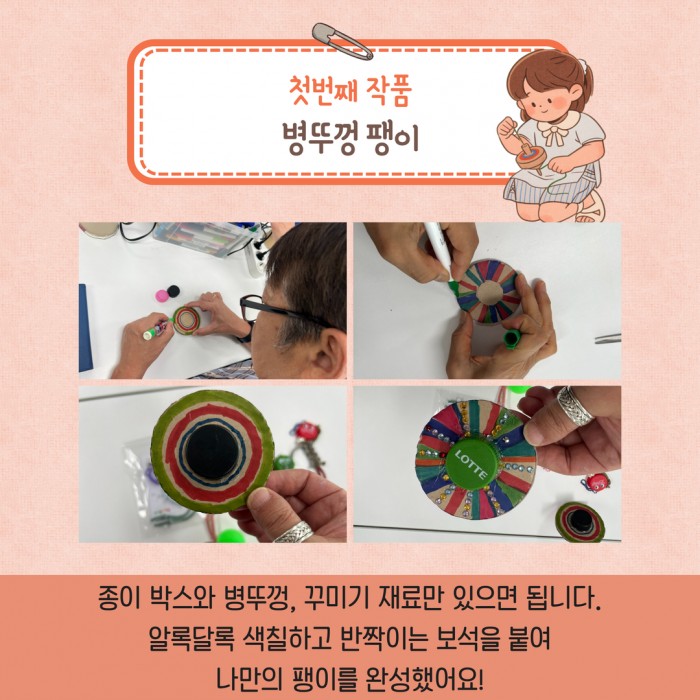 첫 수업에서는 병뚜껑을 활용하여 팽이와 걱정인형을 만들며,