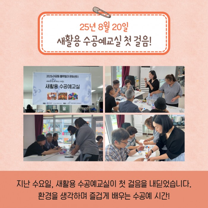 앞으로도 새활용 수공예교실은 환경을 생각하는 마음과 함께 즐거운 배움의 시간을 이어갈 예정입니다.