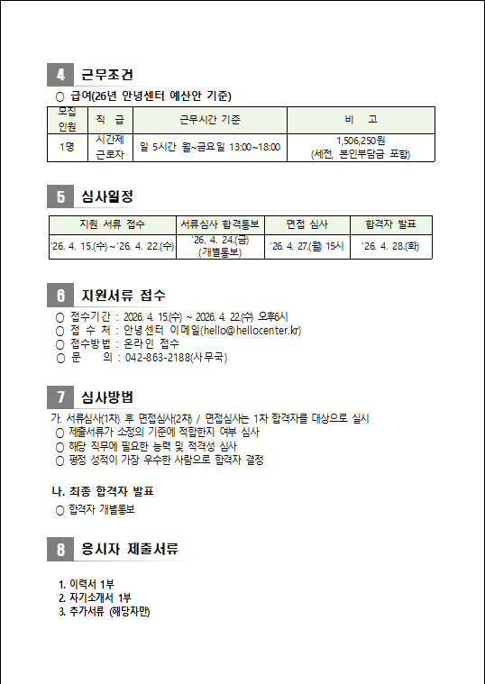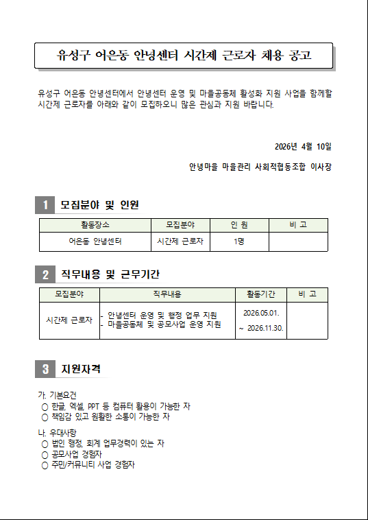 [공고]유성구 어은동 안녕센터 시간제 근로자 채용 공고